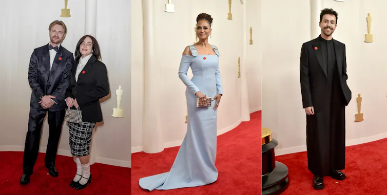 Tahun ini, sebagai tanggapan atas serangan Israel yang sedang berlangsung di Gaza, banyak artis, termasuk Billie Eilish (dalam balutan Chanel) dan Finneas O’Connell, Ava DuVernay (dalam busana Louis Vuitton), Ramy Youssef (dalam thobe hitam cantik karya Zegna), Mahershala Ali, Riz Ahmed dan Mark Ruffalo mengenakan pin merah Artists4Ceasefire.