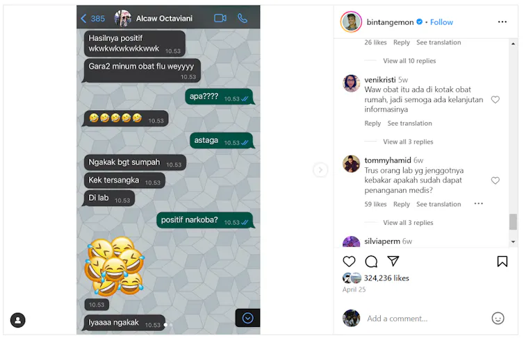 Media sosial sempat digemparkan oleh tangkapan layar yang dibagikan komika Bintang Emon di akun instagramnya. Tangkapan layar tersebut menunjukkan bagaimana istri Bintang Emon mendapatkan hasil positif saat melakukan pengujian laboratorium narkoba. Setelah ditelusuri, hasil positif tersebut ternyata disebabkan oleh obat flu yang ia konsumsi.