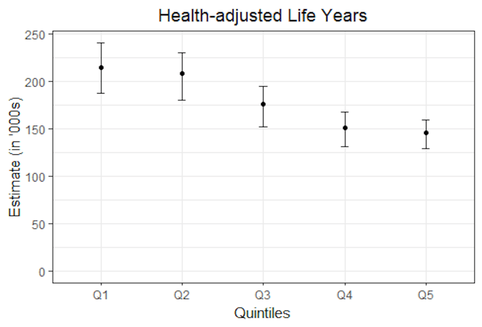 Health benefits were estimated overall, and across income quintiles of the population. We also estimated the likely cost of the policy to the government, and whether it offered value for money.