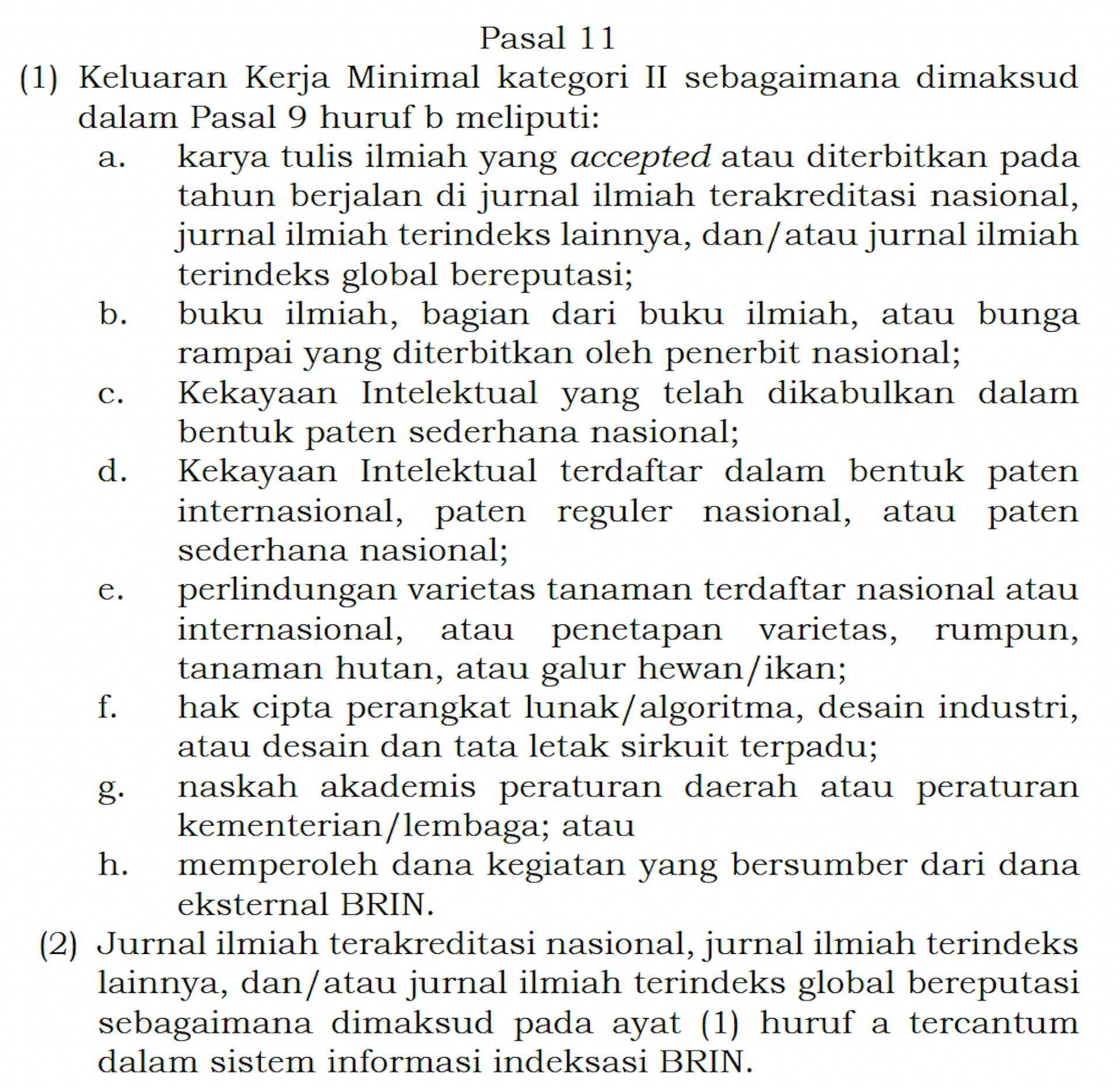 Pertama, pengelolaan sumber daya manusia. Berdasarkan Peraturan BRIN Nomor 1 Tahun 2023 tentang Pengelolaan Kinerja Pegawai di Lingkungan BRIN, para peneliti wajib memenuhi Keluaran Kerja Minimal (KKM) dalam satu periode kerja (empat tahun), dengan kemungkinan perpanjangan satu periode lagi. KKM ini meliputi publikasi ilmiah, buku, atau karya intelektual lainnya.