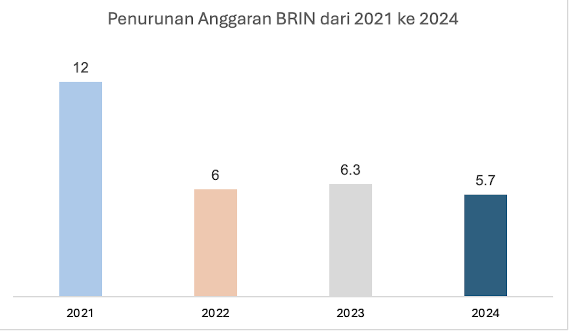 Anggaran BRIN terus menurun setiap tahunnya, dari Rp12 triliun pada 2021 menjadi kurang dari Rp6 triliun pada 2024. Penyusutan anggaran ini diklaim sebagai bentuk efisiensi pasca peleburan infrastruktur riset dari berbagai instansi.