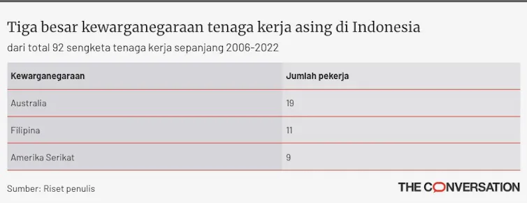 Penelitian saya mencatat 92 sengketa perburuhan yang melibatkan pekerja asing sejak 2006 hingga 2022 yang diselesaikan di Pengadilan Hubungan Industrial. Satu sengketa tambahan diajukan pada 2023, tetapi Pengadilan Hubungan Industrial belum menerbitkan putusannya meskipun ada kewajiban hukum untuk melakukannya.