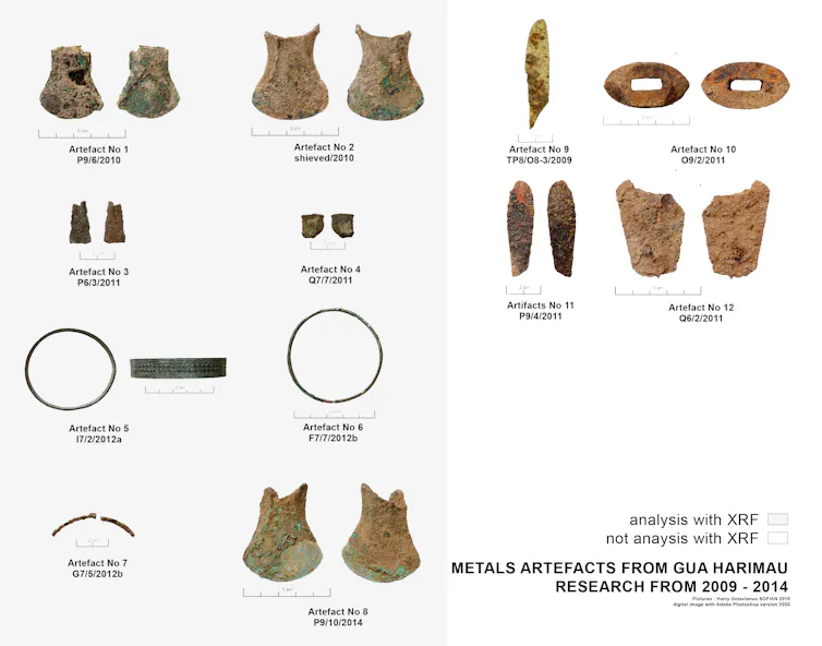 Artefak logam dari Gua Harimau. Catatan: Artefak nomor 1-8, di sebelah kiri, telah diperiksa dengan fluoresensi sinar-X.