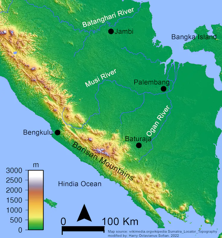 Peta yang menunjukkan letak Gua Harimau dan Sungai Musi, yang membentang dari pedalaman hingga pesisir, dan anak-anak sungainya.