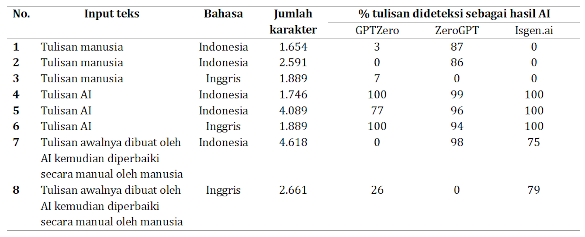 Hasil pengujian untuk tulisan manusia dalam bahasa Indonesia, GPTZero dan Isgen.ai menunjukkan akurasi tinggi dengan persentase kesalahan yang sangat rendah (0-3%). Sedangkan ZeroGPT sering salah mendeteksi tulisan manusia sebagai buatan AI dengan tingkat kesalahan hingga 87%.