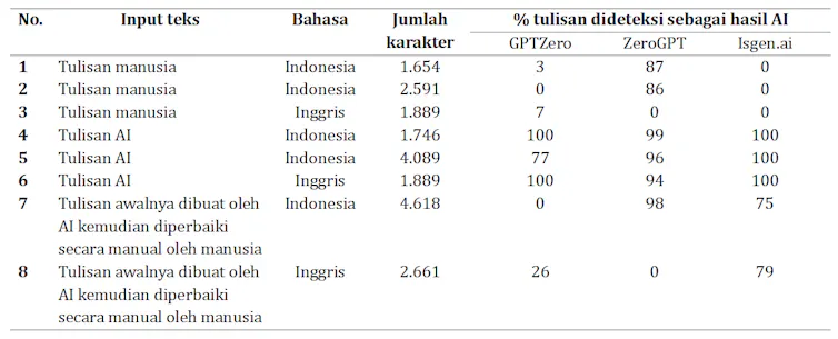 Untuk memberikan gambaran tentang akurasi deteksi AI, penulis melakukan pengujian terhadap beberapa aplikasi, seperti GPTZero, ZeroGPT, dan Isgen.ai. Ketiganya merupakan aplikasi gratis yang banyak digunakan di Indonesia.