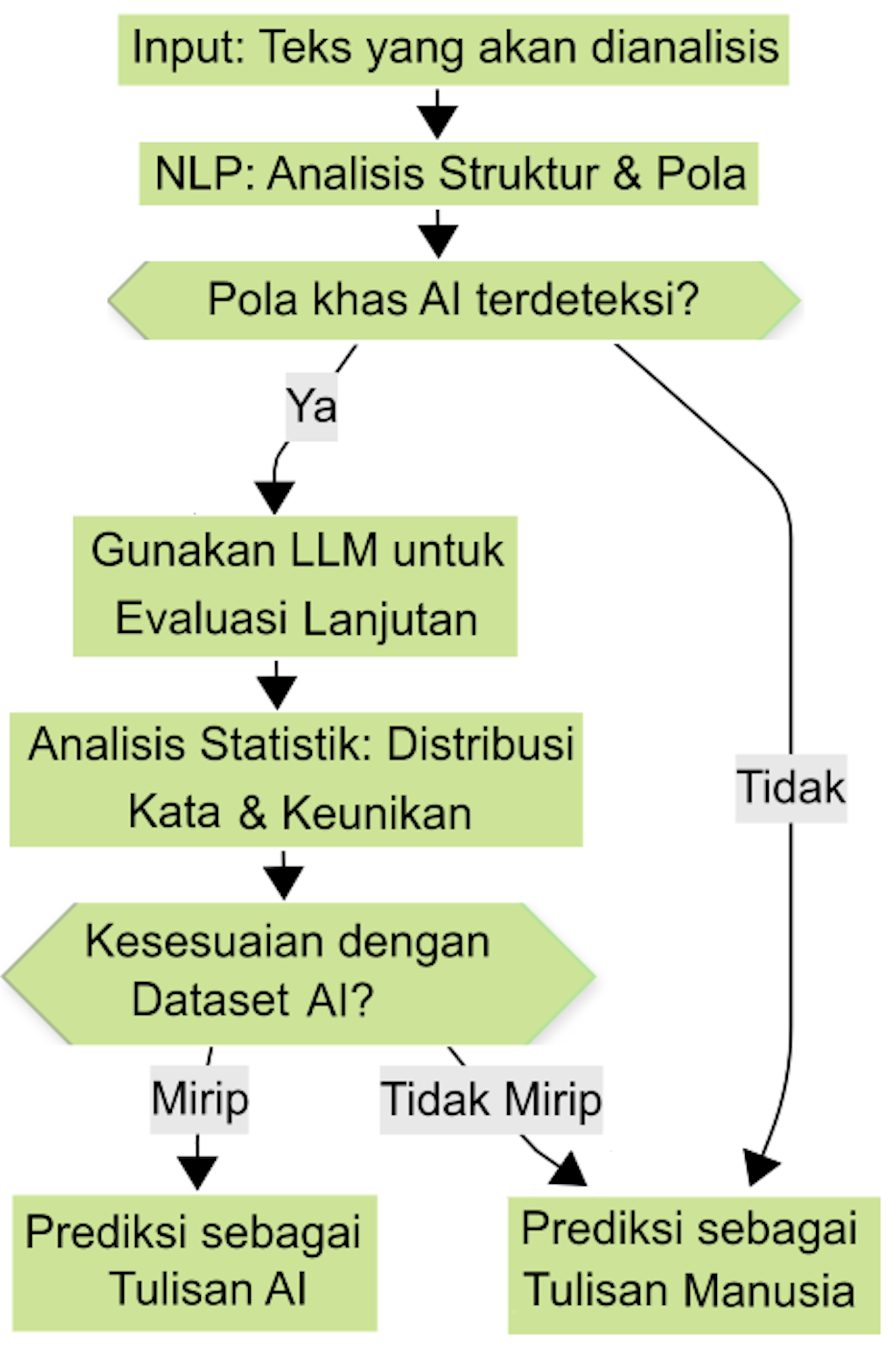 Jika suatu teks mengikuti pola yang sangat mirip dengan keluaran AI, sistem akan menilainya sebagai tulisan yang dibuat oleh mesin. Pola yang dijadikan dasar dalam deteksi tulisan AI antara lain tingkat kebakuan bahasa, pengulangan kata atau frasa, dan struktur kalimat yang seragam. Tulisan yang sangat baku, tanpa variasi, dan sering muncul berulang cenderung dianggap sebagai buatan AI.