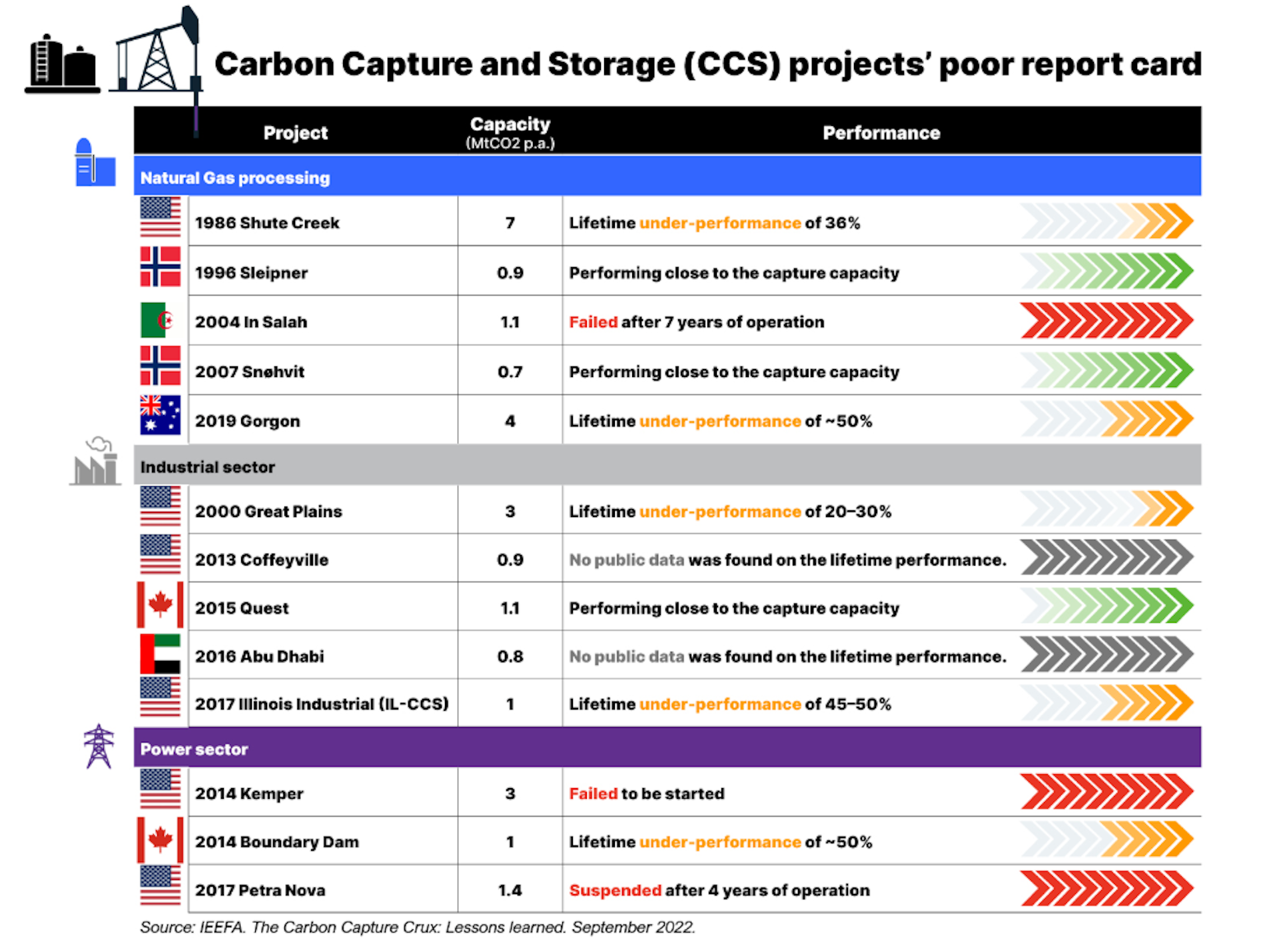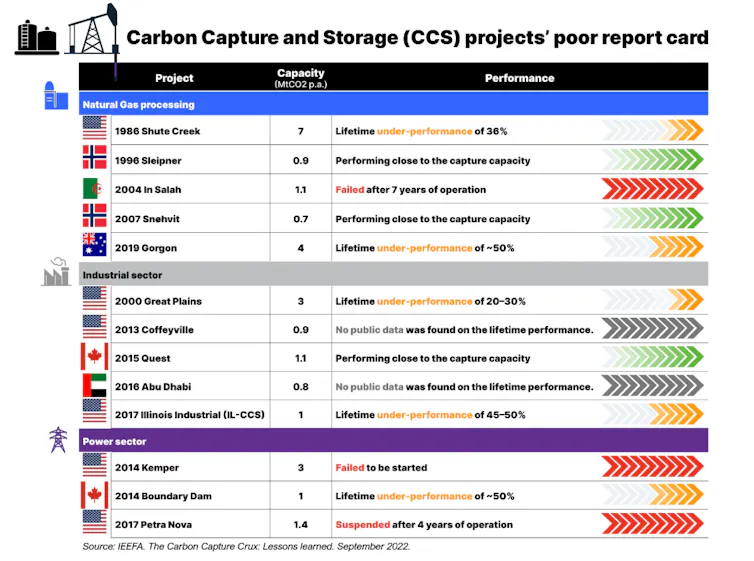 Kegagalan proyek tersebut umumnya disebabkan oleh kendala teknis, seperti tekanan di tempat penyimpanan karbon yang terlalu rendah dan kebutuhan energi yang sangat besar.