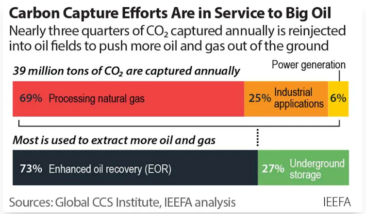 Adapun tiga proyek penangkapan karbon yang diklaim sukses, semuanya berbasis EOR alias memicu produksi lebih banyak bahan bakar fosil yang ujungnya malah melepaskan lebih banyak emisi.
