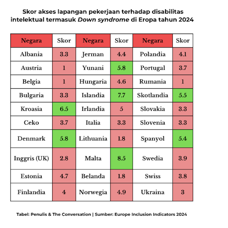 Bahkan, kondisi di Eropa hanya sedikit lebih baik. Dalam indeks Europe Inclusion Indicators 2024 benua yang terkenal sangat mengedepankan inklusivitas hanya mendapat skor 4 dari 10 terhadap pemerataan pekerjaan bagi penyandang disabilitas intelektual, termasuk Down syndrome.