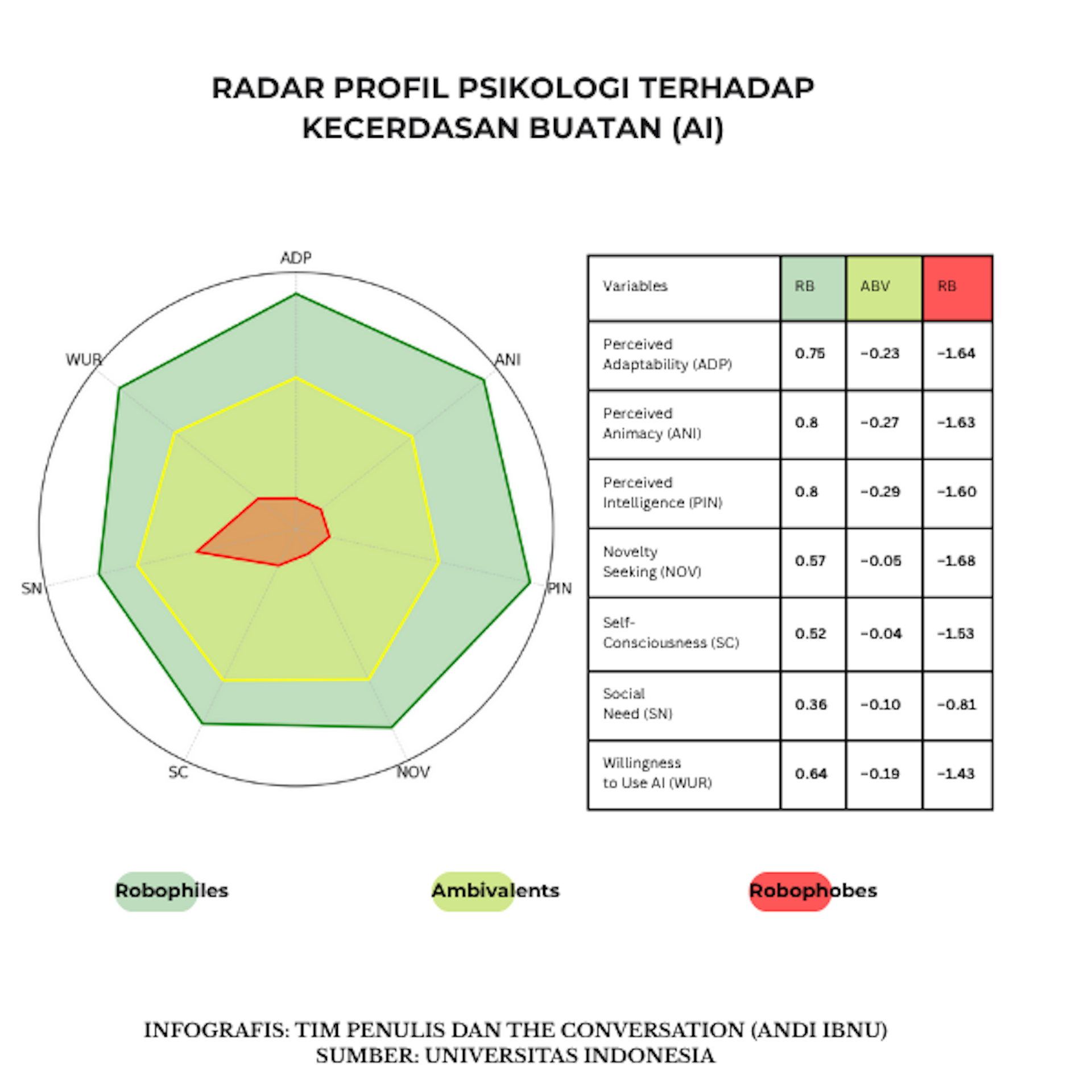 Di sisi lain, sekitar 13% responden tergolong robophobes. Mereka cenderung cemas, merasa tidak nyaman, atau bahkan menolak berinteraksi dengan AI.