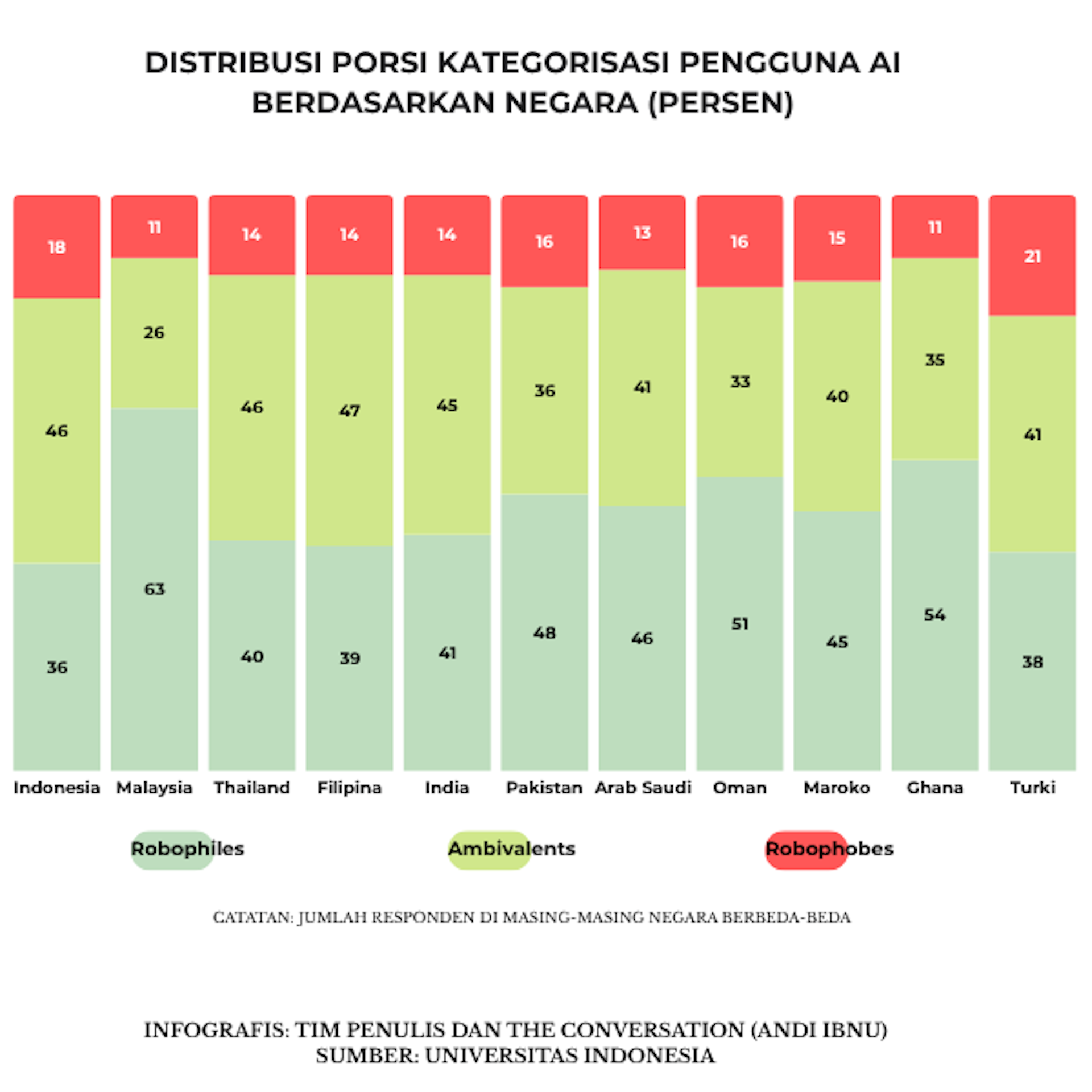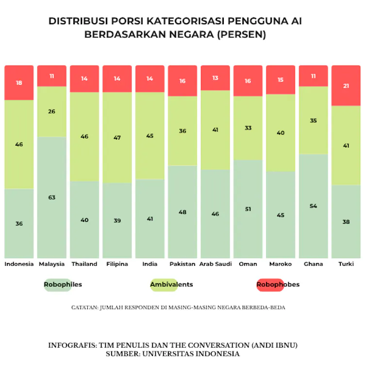 Uniknya, persepsi terhadap AI juga berbeda antarnegara. Malaysia dan Ghana memiliki lebih banyak robophiles, sedangkan Indonesia dan Turki didominasi kelompok yang ambivalen.