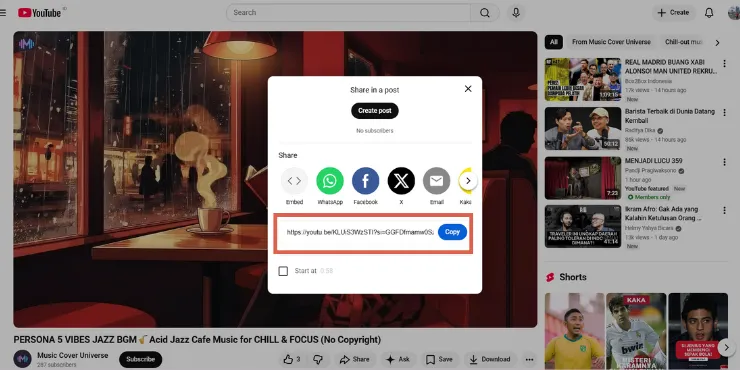 2. Salin link video YouTube dari address bar atau menu share.