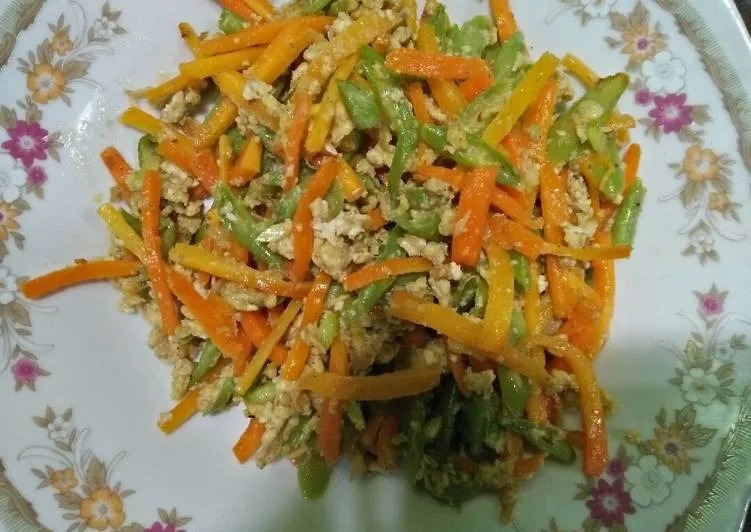 - Masukkan wortel dan telur yang sudah dikocok. Orak-arik, hingga tercampur. Lalu, masukkan buncis.