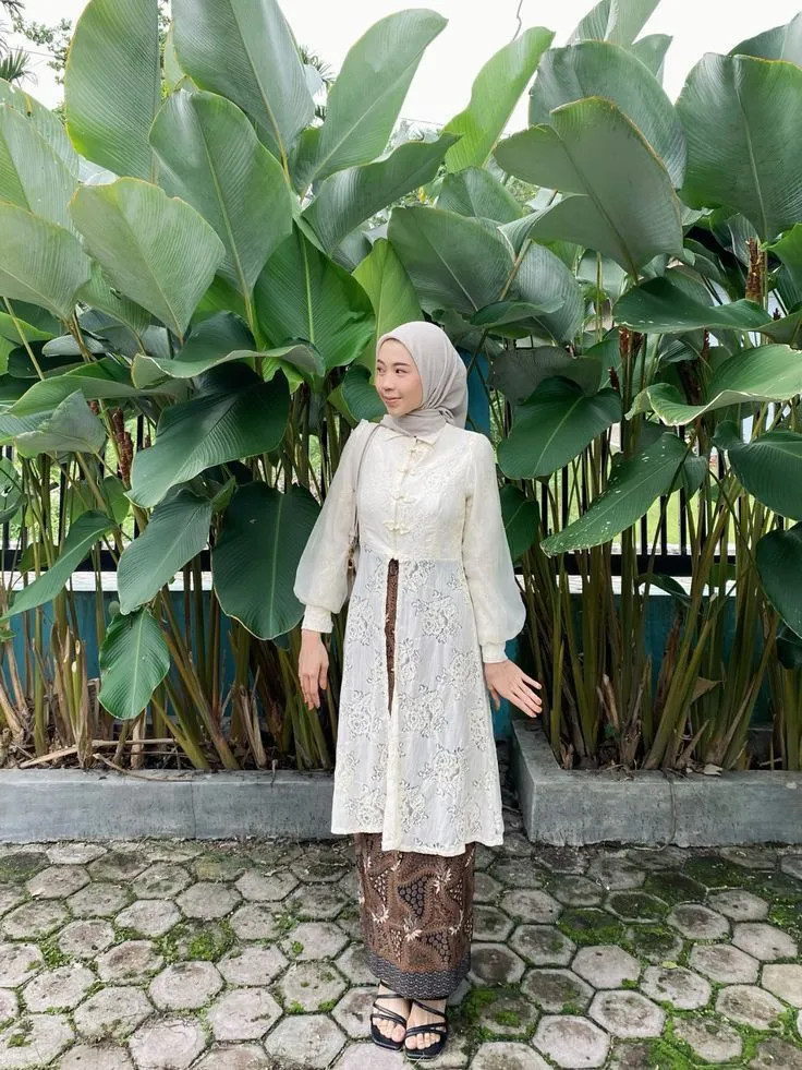 Mau pakai setelan batik ke kondangan tetapi konsepnya mewah? Kamu bisa coba perpaduan kebaya kimono yang dilengkapi detail renda dengan celana kulot bahan semi sutera seperti ini agar tampak begitu cantik dan effortless. Penampilan yang satu ini recommended buat kamu yang suka pakaian batik.