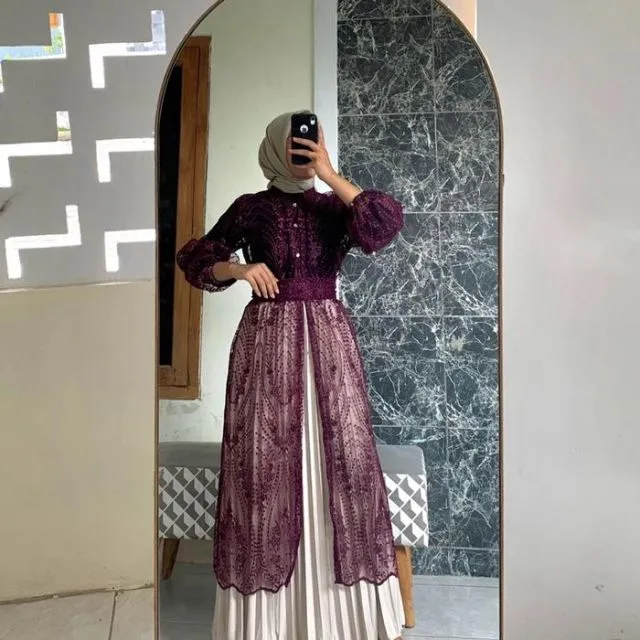 Cukup padukan tunik brokat tile bergaya kurung ini dengan rok plisket kesayanganmu untuk menghasilkan look anggun namun minimalis. Perpaduan warna ungu dan ivory rupanya ciamik abis!