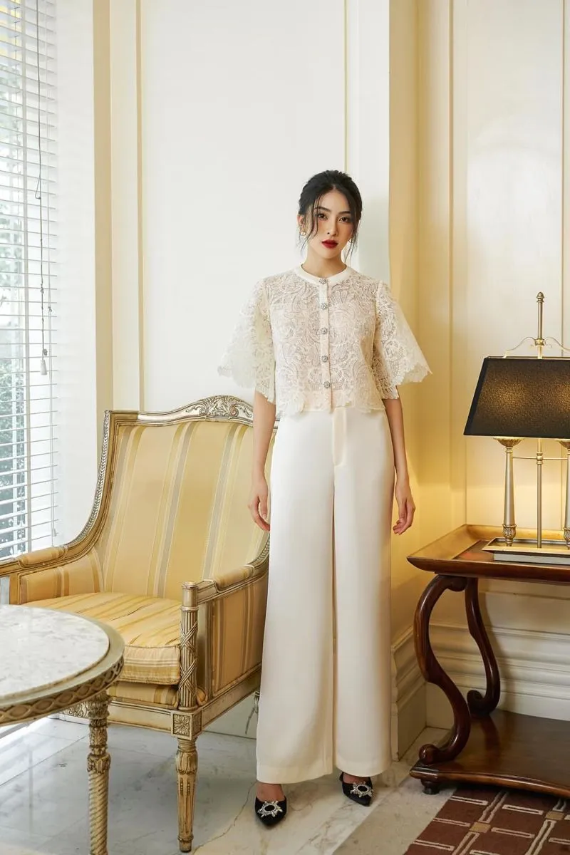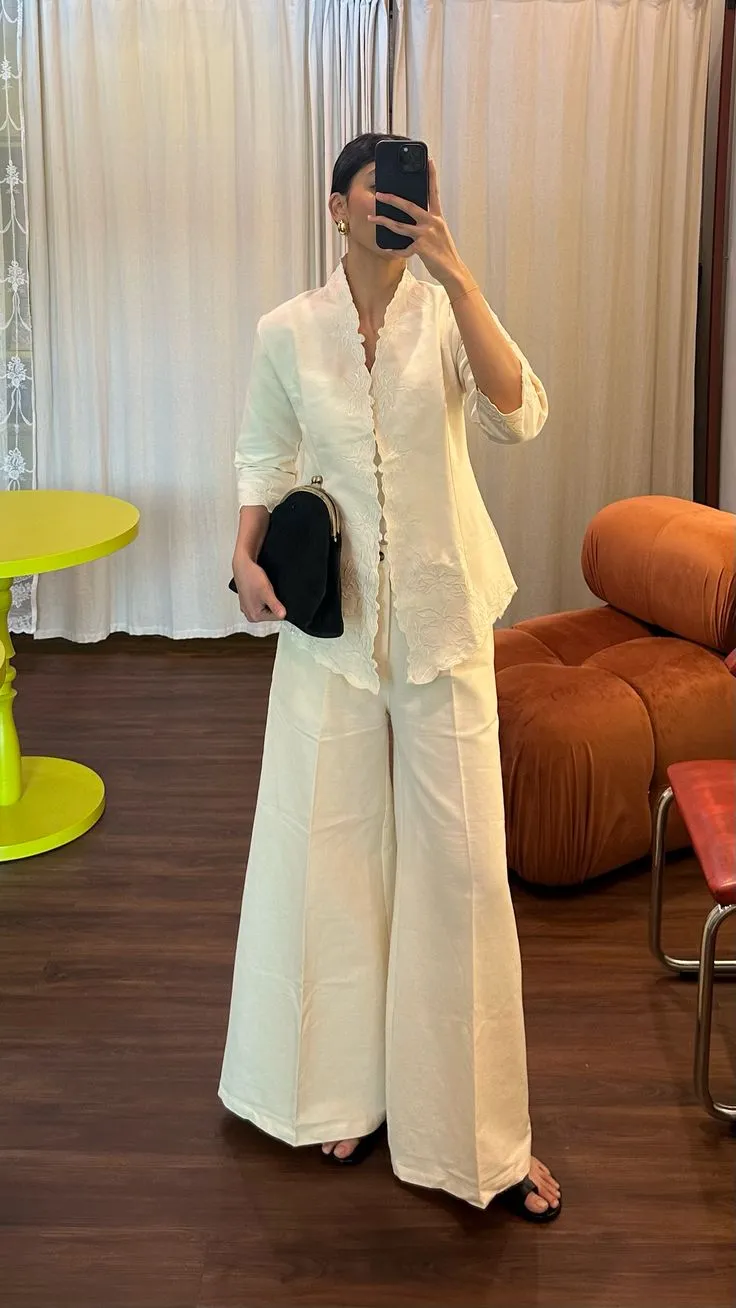 Atasan brokat dan celana palazzo memberikan kesan profesional tanpa kehilangan unsur tradisional. Apalagi kalau kamu memilih warna putih ivory yang memberikan kesan clean dan sophisticated.