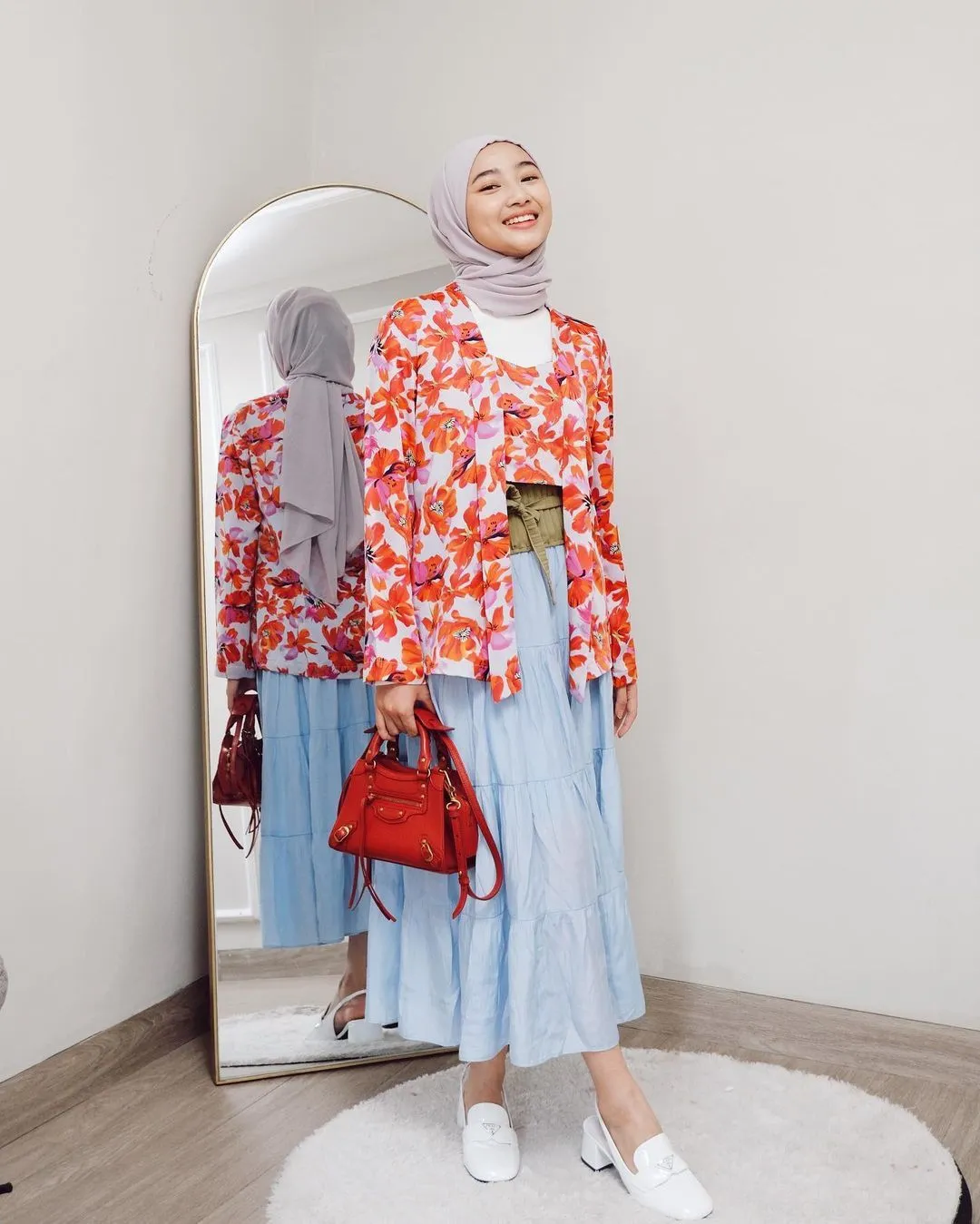 One set kebaya encim modern dengan celana wide leg dalam satu warna sama menciptakan ilusi siluet yang panjang dan seamless. Ditambah dengan flat sandals yang bentuknya unik, rupanya mampu melengkapi vibe modern dari look ini. Buat kamu yang mau tampil simple tanpa kehilangan look yang elegan, coba deh aplikasiin style baju kartini kayak gini! Kebaya encim emang nggak pernah gagal dan selalu timeless!