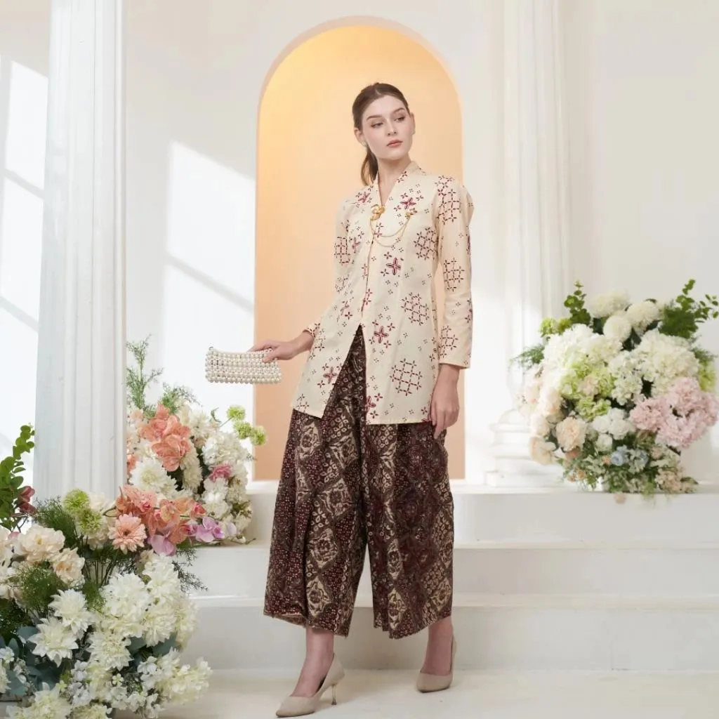 Kebaya Karini bermotif batik ini dibuat dengan cutting modern yang pas di pinggang, sehingga menciptakan kesan ramping dan nge-fit. Kemudian dikombinasikan dengan kulot janggan angking yang memberikan kesan effortless tapi tetap anggun.