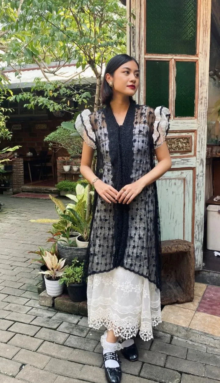 Lace vest didesain sebagai outerwear yang memberikan fleksibilitas tinggi. Kamu bisa mengontrol seberapa casual tampilanmu dengan rok bordir yang tepat. Sementara itu, flat shoes kekinian cocok untuk outdoor event yang berlokasi di taman atau area terbuka. Kombinasi ini bisa kamu modifikasi dengan mengganti kebaya model crop atau blouse dan rok sesuai suasana hati.