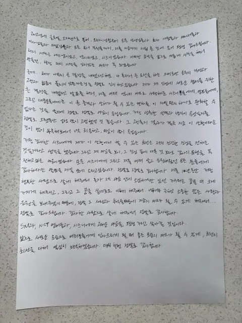 Namun… betapapun besarnya keputusan yang telah kubuat, aku sepenuhnya memahami bahwa menganggap ini sebagai tantangan besar yang kuhadapi sendiri tidak menghilangkan kekhawatiran, keprihatinan, atau rasa sakit semua orang. Dengan mengumumkan keputusan besar ini untuk babak baru dalam hidupku, aku tahu perubahan ini mungkin akan sangat mengejutkan, dan bahkan mungkin menyakiti Czennies yang telah mencintaiku sebagai Mark NCT, penggemar Mark, dan masyarakat umum, dan aku juga tahu bahwa satu surat tulisan tangan tidak dapat meringankan semua itu. Karena itu, hatiku terasa sangat berat. Aku menghabiskan waktu yang sangat lama untuk berpikir mendalam tentang pilihan yang paling matang dan cara yang tepat untuk menghadapi ini. Aku benar-benar menyesal bahwa hasil dari semua pemikiran itu telah menghasilkan sesuatu yang mungkin masih terasa kurang, dan itu sangat membebani hatiku”