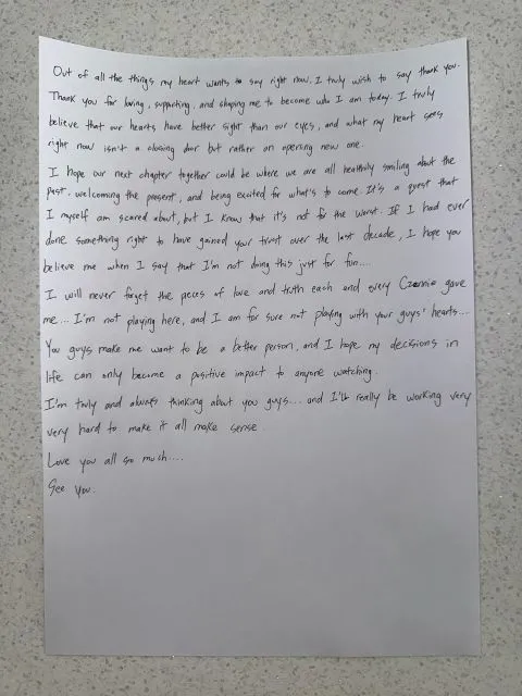 Kuharap babak selanjutnya dalam hidup kita bersama akan dipenuhi dengan senyum bahagia mengenang masa lalu, menyambut masa kini, dan bersemangat menantikan masa depan. Ini adalah perjalanan yang membuatku takut, tetapi aku tahu ini bukan untuk hal terburuk. Jika aku pernah melakukan sesuatu yang benar untuk mendapatkan kepercayaan kalian selama dekade terakhir, kuharap kalian percaya ketika kukatakan bahwa aku tidak melakukan ini hanya untuk bersenang-senang. …