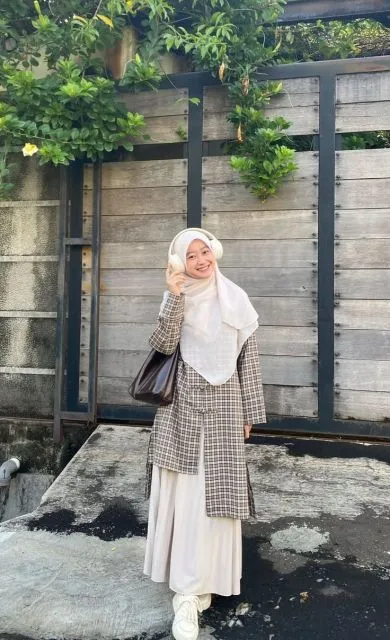 Buat musim hujan atau ke kafe ber-AC! Rok rempel panjang warna beige hangat dipadu tunik oversized dengan detail button sangatlah pas. Kemudian, kamu bisa percantik diri agar bisa tampi syar’i dan modern dengan mengenakan segiempat bahan wool yang tebal bikin hangat dan stylish.