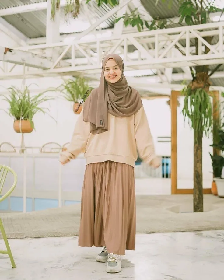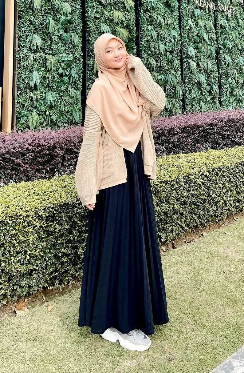 Styling kayak gini bisa jadi combo simple yang selalu works! Rok plisket panjang warna hitam dipadukan knitwear warna kopi susu bikin look kamu tampak clean dan sopan. Apalagi pakai hijab segitempat yang menutup dada justru menambah kesan syar’i tanpa kelihatan jadul. Biar makin comfy, kamu bisa pakai sepatu casual seperti sneakers cewek warna putih. Udah deh, cocok buat nongkrong di cafe atau sekadar jalan-jalan ringan aja.