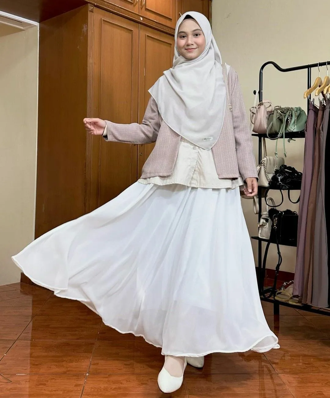 Kalau kamu mau tampil ala business casual yang on point, perpaduan antara rok organza putih dengan blazer Korean style sangatlah cocok! Kamu bisa kenakan gaya semi-formal ini buat presentasi atau meeting, baik di kantor atau on site maupun di luar. Ditambah lagi, rok panjang bahan organza yang sudah dilapisi furing nggak akan bikin kamu ngerasa canggung saat tampil syar’i.