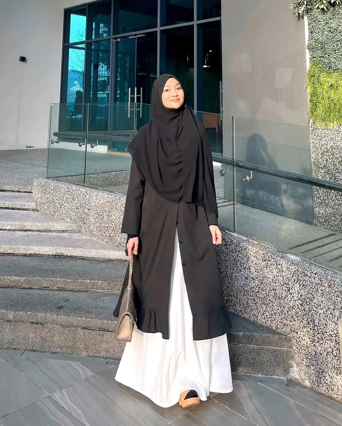 Buat yang kerja di kantoran, style ini wajib dicoba! Rok A-line panjang sampai mata kaki dipadu tunik panjang warna hitam yang dilengkapi detail ruffle ngasih kesan yang manis tapi juga profesional. Buat hijabnya, kamu bisa pakai pashmina instan biar lebih matching dengan gaya ini. Mau tampilan lebih perfect? Coba pakai sepatu wedges atau heels.
