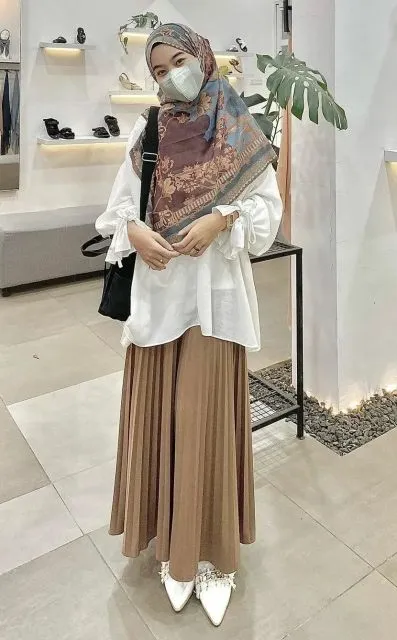 4. Blouse Putih dan Rok Plisket Pakai Hijab Motif
