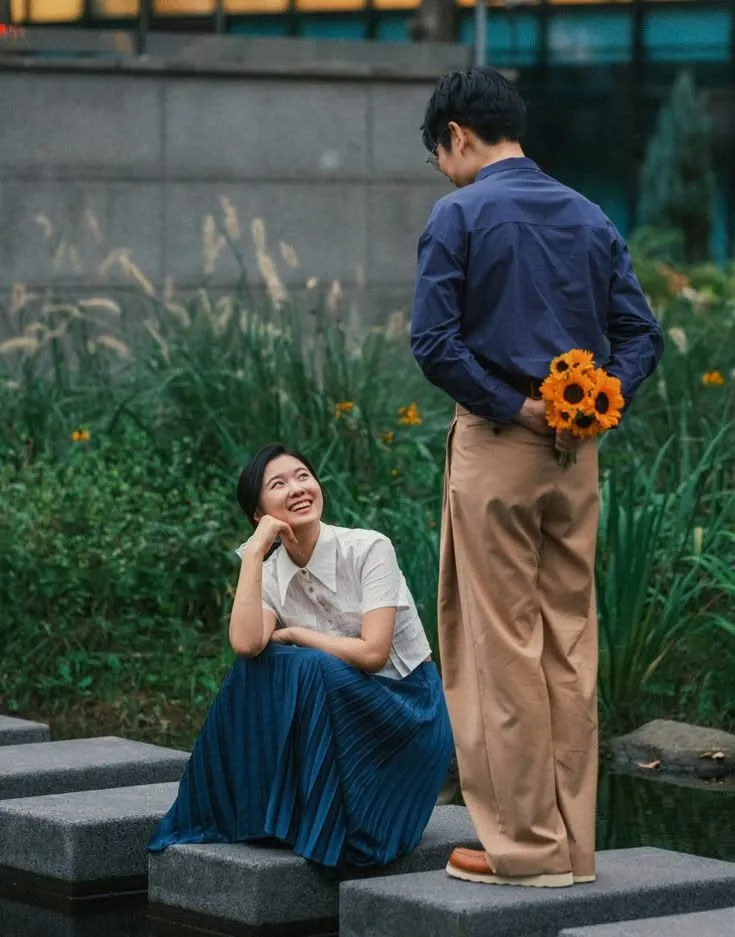 Selanjutnya, kemeja polos warna biru kombinasi earth tone juga bisa jadi pilihanmu untuk mendapatkan tampilan kasual pada foto pre-wedding yang simple, tetapi penu makna. Untuk menambah kesan romantis, tambahkan properti dengan adegan yang meaningful agar hasil footage-nya terasa deep. Misalnya saja ingin memberikan kejutan berupa setangkai bunga.