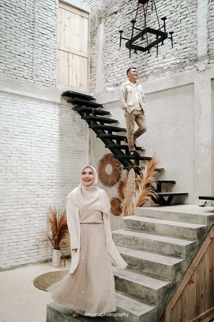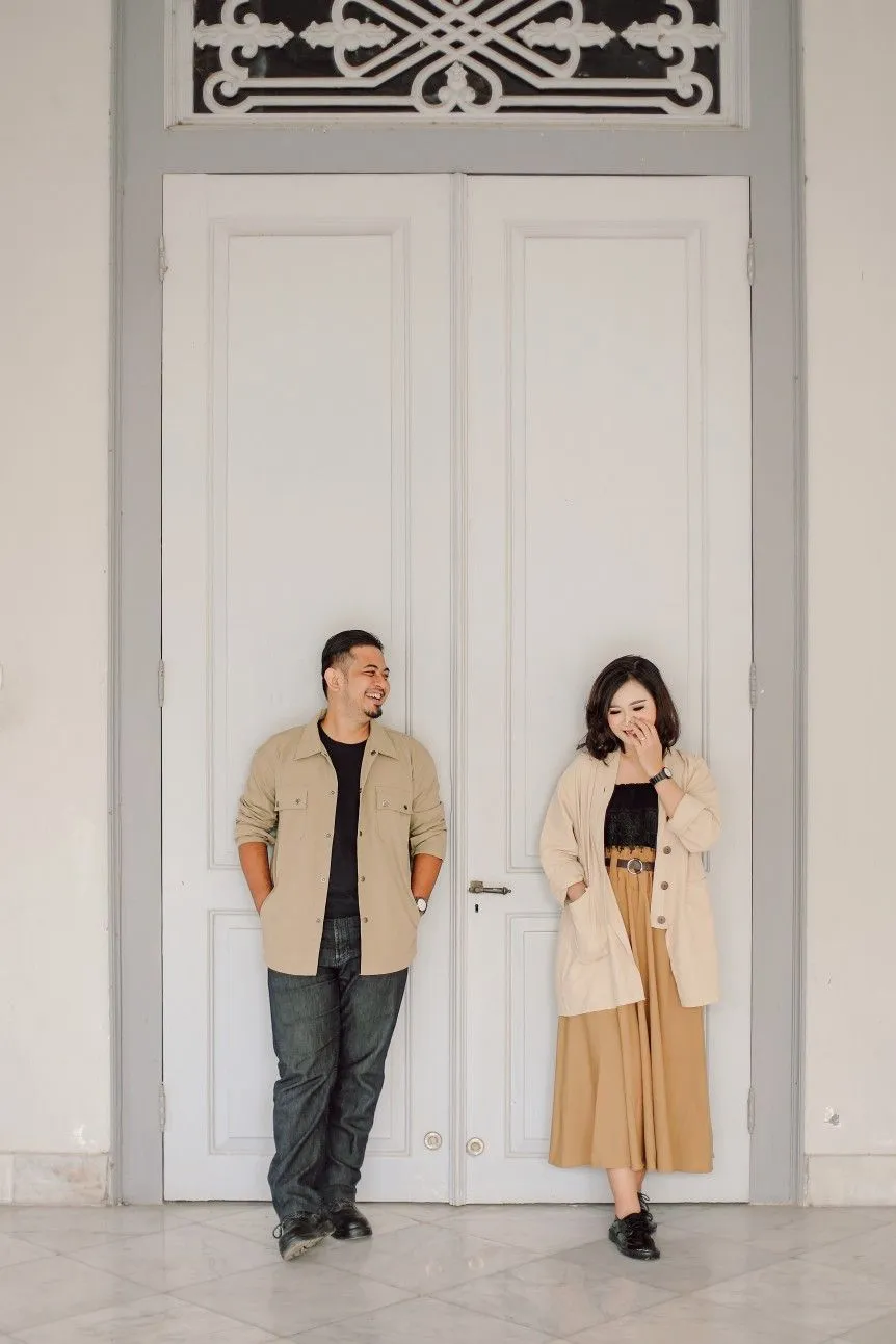 Bingung mau pakai outfit simple kayak apa buat pre-wed? Kamu bisa contoh couple ini! Calon pengantin perempuan mengenakan long outer dengan kaos sebagai layer pertama, kemudian disusul dengan rok tutu yang dilengkapi detail payet. Warna yang sama ditunjukkan oleh mempelai laki-laki yang memakai overshirt dan sneakers, sehingga keduanya tampil lebih santai.