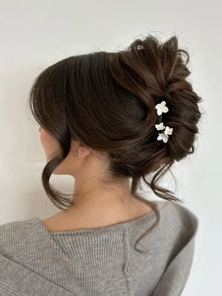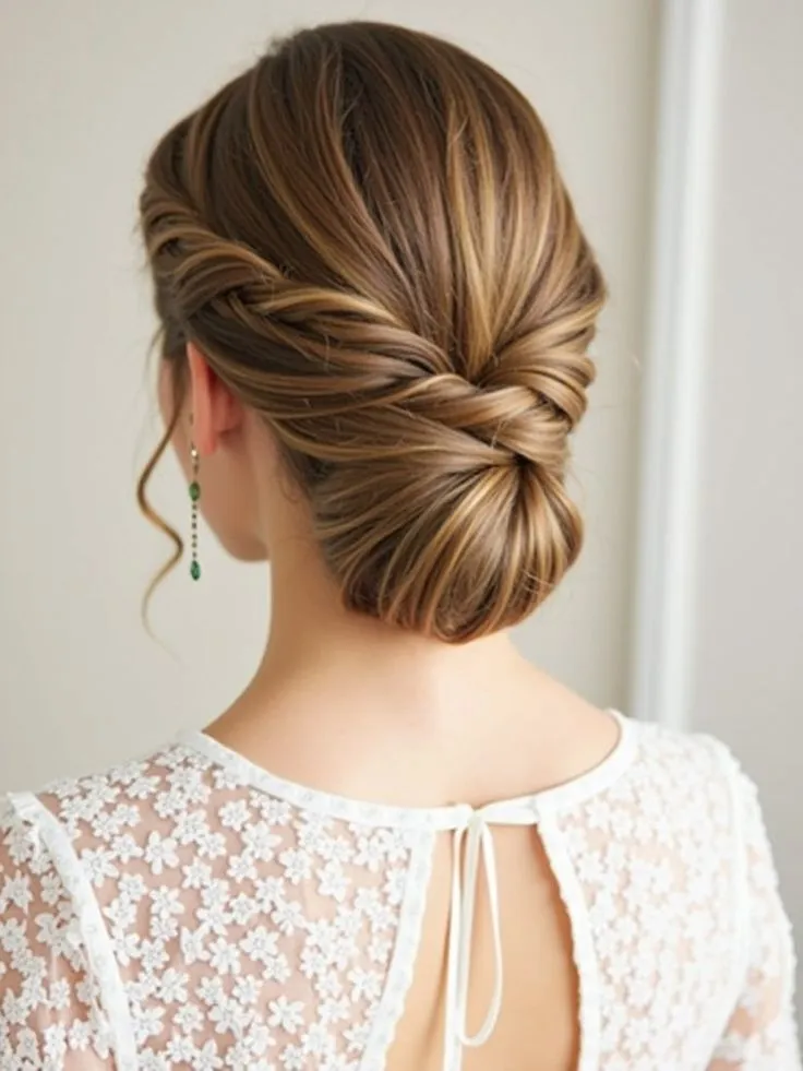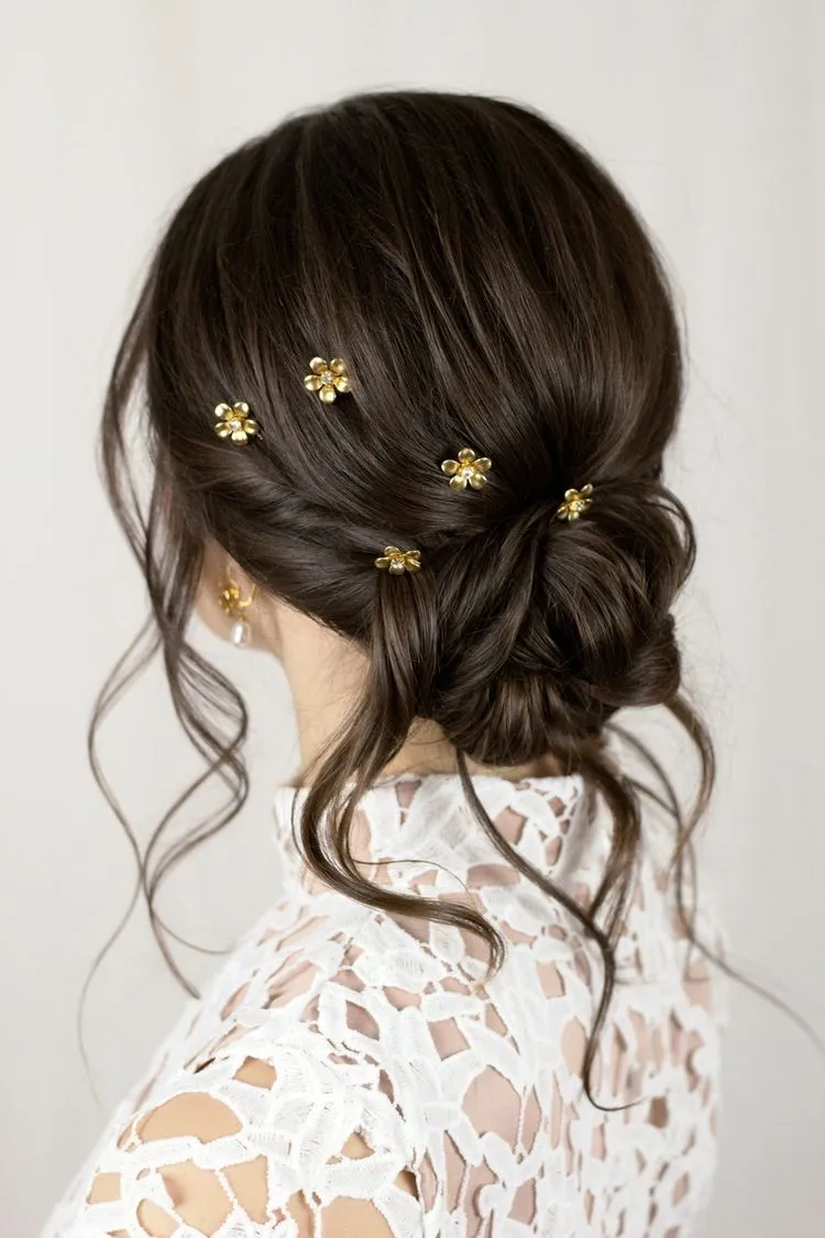 Sedikit mirip dengan gaya rambut cepol bawah, akan tetapi untuk styling yang satu ini diberikan tekstur yang berlayer di kepala bagian belakang. Kemudian ada penambahan aksesori berupa hair pin emas, jadinya keliatan formal dan classy. Cocok banget dijadikan salah satu gaya rambut untuk bridesmaid kekinian yang cantik!