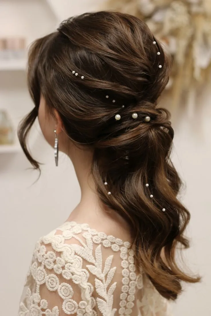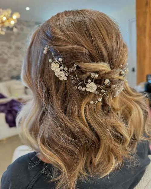 Sedikit messy hair dan dibiarkan bergelombang untuk kamu yang rambutnya sebahu ternyata cocok juga buat kondangan, lho. Sisanya, kamu bisa ikat sedikit rambut di belakang. Biar makin feminin, kamu bisa tambahkan headpiece bernuansa bunga dengan detail mutiara.