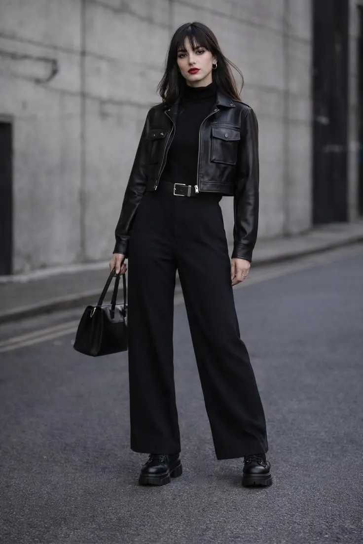 1. Kombinasi Jaket Kulit Crop Top, Kaos V-Neck, dan Celana High-Waist