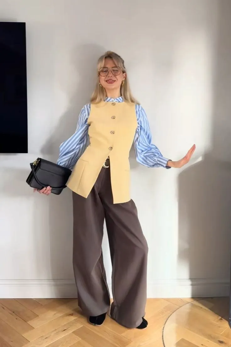 5. Vest Lengan Panjang, Strip Blouse, dan Celana Kulot