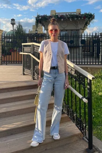 Musim panas tapi kamu harus ngantor atau ada tugas di luar? Nih, kamu bisa memadukan antara vest warna beige dengan kaos putih. Dengan begitu, tampilan kamu masih terlihat formal, tapi juga tetap adem seharian. Untuk bawahannya, kamu bisa memakai wide-leg jeans biar jadi smart casual yang perfect untuk summer.  Warna neutral atau pastel memberi kesan professional yang fresh buat wanita usia 30 tahun ke atas. Biar outfit summer wanita yang satu ini makin kece, pakai sneakers yang warnanya senada dengan vest atau kaosnya dan pilih kacamata sesuai bentuk wajah kamu.