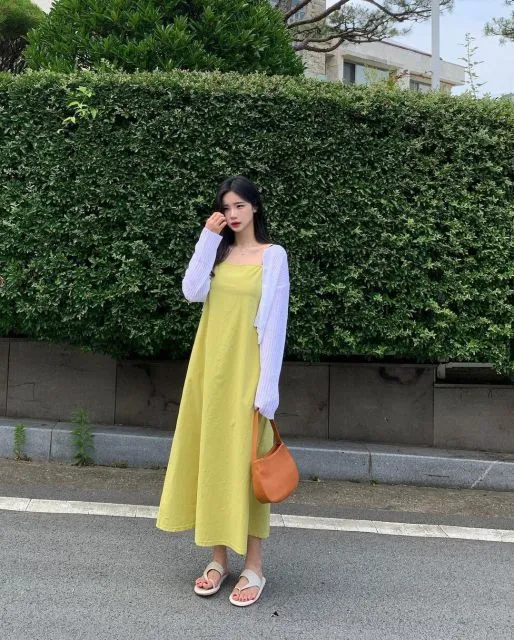 Setelan apron cami dress berbahan linen dan cardigan putih itu memberi kesan feminin yang lagi tren banget. Linen termasuk material kain yang breathable dan semakin dipakai justru semakin bagus jatuhnya. Dengan memadukan keduanya, look kamu jadi terlihat natural, minimalis, tapi tetap berkelas. Penampilan seperti ini cocok dipakai untuk pergi ke coffee shop, nge-mall, dan menikmati sunset di pantai. Tinggal tambahin aja pakai sandal musim panas dan bawa handbag buat nyimpen HP serta makeup kamu.