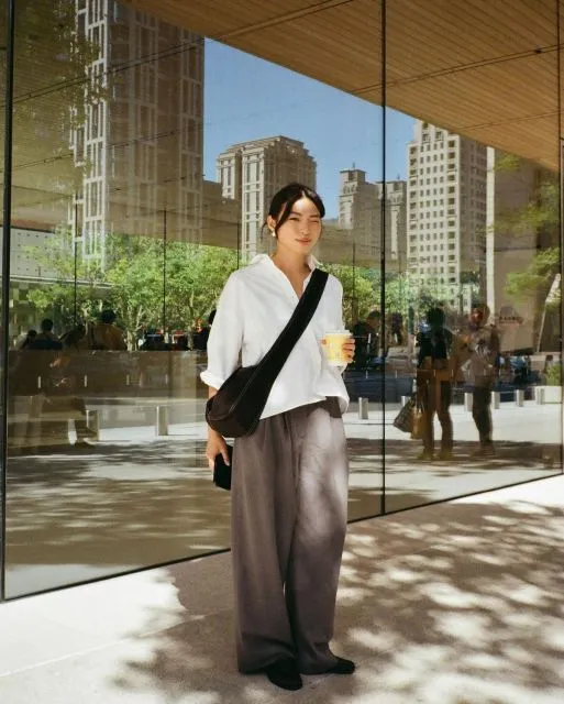 Kemeja Oxford oversized putih itu nyaman banget dan bisa dibuat formal atau casual tergantung cara styling. Dipadu dengan wide-leg  trousers (celana potongan lebar) yang flowy, look ini jadi effortless tapi tetap stylish. Kamu nggak perlu menyelipkan bagian ujung baju ke bagian depan, jadi cukup biarkan loose buat ngasih kesan yang berbeda. Perpaduan warna putih dan cokelat memberi kesan summer yang simple, tapi menyenangkan.
