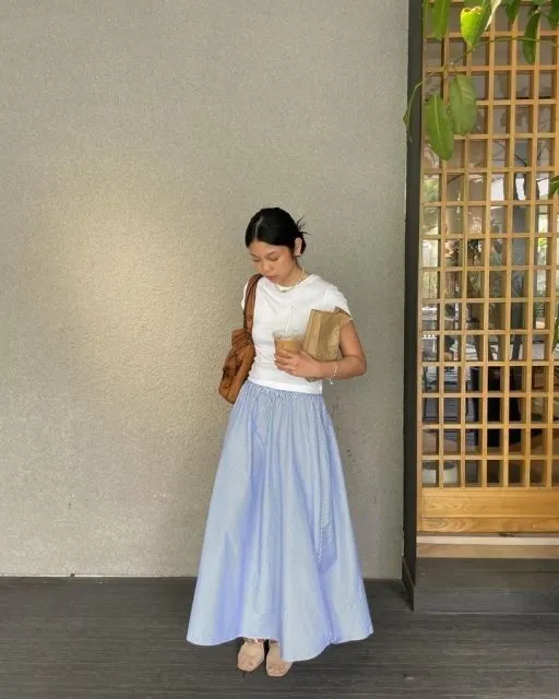 Rok maxi desain A-line dengan bahan ringan memang bisa jadi salah satu ide outfit summer wanita masa kini, karena selain stylish juga nyaman dipakai saat full kegiatan di luar. Dipadu dengan kaos basic yang breathable, look ini jadi casual tapi tetap feminin. Pilih warna pastel atau soft neutral untuk kesan summer yang fresh.
