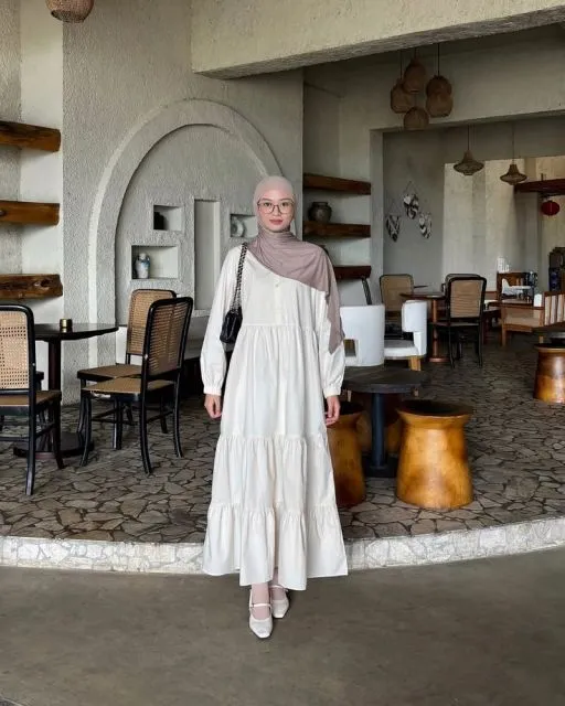 Maxi dress yang adem ini dibuat dari bahan katun rayon agar kamu nggak mudah merasa gerah. Cutting-nya longgar dan nyaman, tidak menempel di kulit saat keringetan. Warna putih memberi kesan fresh dan clean, cocok banget untuk summer vibes. Panjangnya yang maxi juga bisa melindungi kakimu dari sinar matahari. Biar tetap adem seharian selama main di outdoor, kamu bisa pakai pashmina dengan tidak melilitkannya pada leher agar tetap breathable. Jangan lupa juga pakai kaos kaki agar kaki kamu nggak belang.