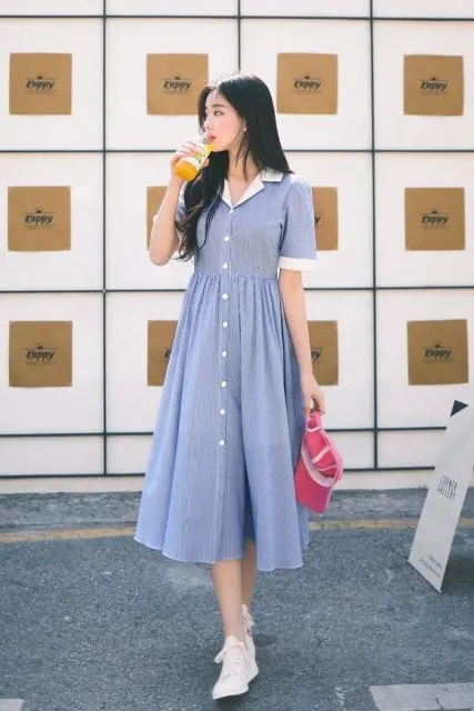 Dress midi dari bahan katun terkenal akan kemampuannya dalam menyerap keringat dan tetap nyaman dipakai seharian meski cuaca lagi panas-panasnya. Selain itu, dress ini juga fokus pada panjangnya yang midi (di bawah lutut) yang menambah kesan tetap sopan bagi pemakainya. Bagi penyuka tampilan casual saat musim panas, pakai midi dress strip kerah putih kayak gini bakal bikin look kamu makin anggun dan classy. Lalu, tambah lagi dengan memakai sepatu sneakers cewek dari brand lokal! Beuh.. makin mantep, deh.