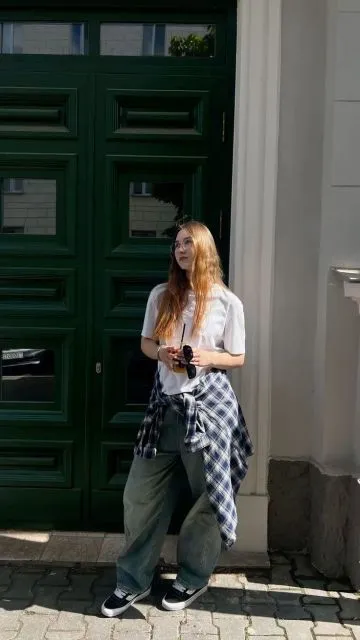 9. Kaos Putih, Flanel, dan Wide-Leg Jeans