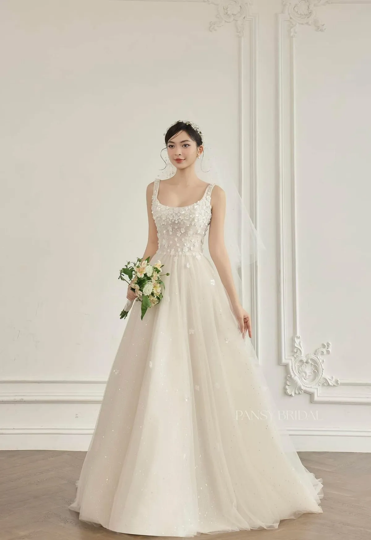 Masih dari koleksinya Kelly Sonyunhui yang selalu fresh, gaun pengantin yang dipercantik dengan 3D floral applique menciptakan kesan yang delicate. Dengan mengenakan gaun ini, kamu bisa menampilkan kesan yang romantic dan feminine tanpa terlalu bling-bling. Detail ini juga menarik fokus perhatian ke desain baju bagian atas dan memperpanjang leher kamu.
