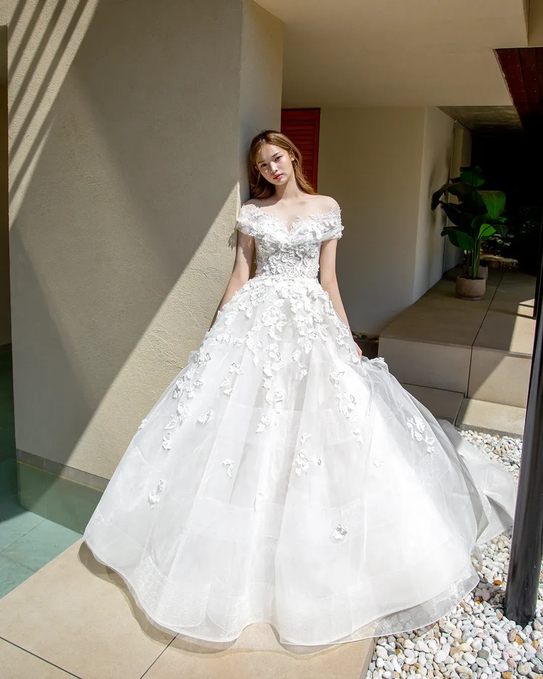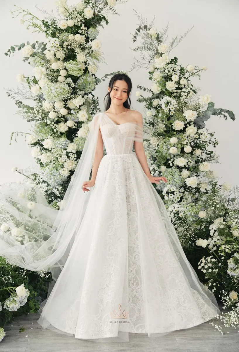 Gaun pengantin dengan sheer off-shoulder strap atau bahu terbuka sebelah cocok untuk body type Indonesia yang umumnya berbahu lebar atau berlengan besar. Adanya tulle strap yang terstruktur menyamarkan lengan sekaligus menciptakan kesan princess yang anggun. Warna putih yang terlihat clean juga sangat cocok dengan kulit putih atau kuning langsat.