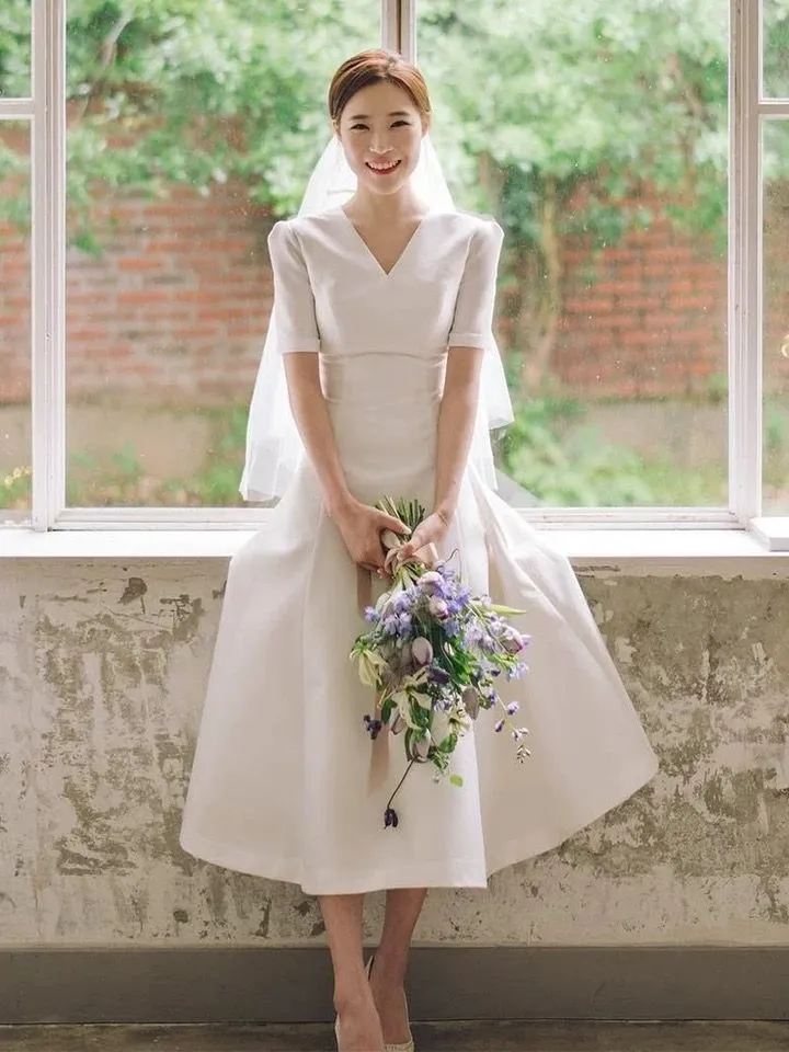 Buat kamu yang mau pakai gaun pengantin Korea model tea-lenght sangat direkomendasikan agar menggunakan konsep outdoor garden wedding, afternoon tea party wedding, atau vintage-themed indoor wedding yang intimate dan fun.