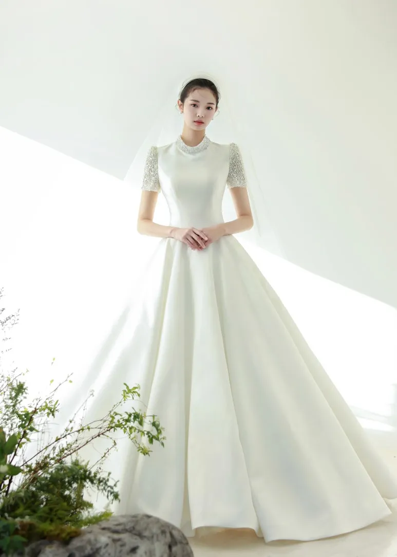 High neckline detail sangat cocok untuk bride Indonesia yang ingin tampil modest tanpa kehilangan elegansi. Satin yang mengkilap dengan cutting A-line juga sangat flattering untuk berbagai body type, termasuk yang petite karena menciptakan kesan tinggi.