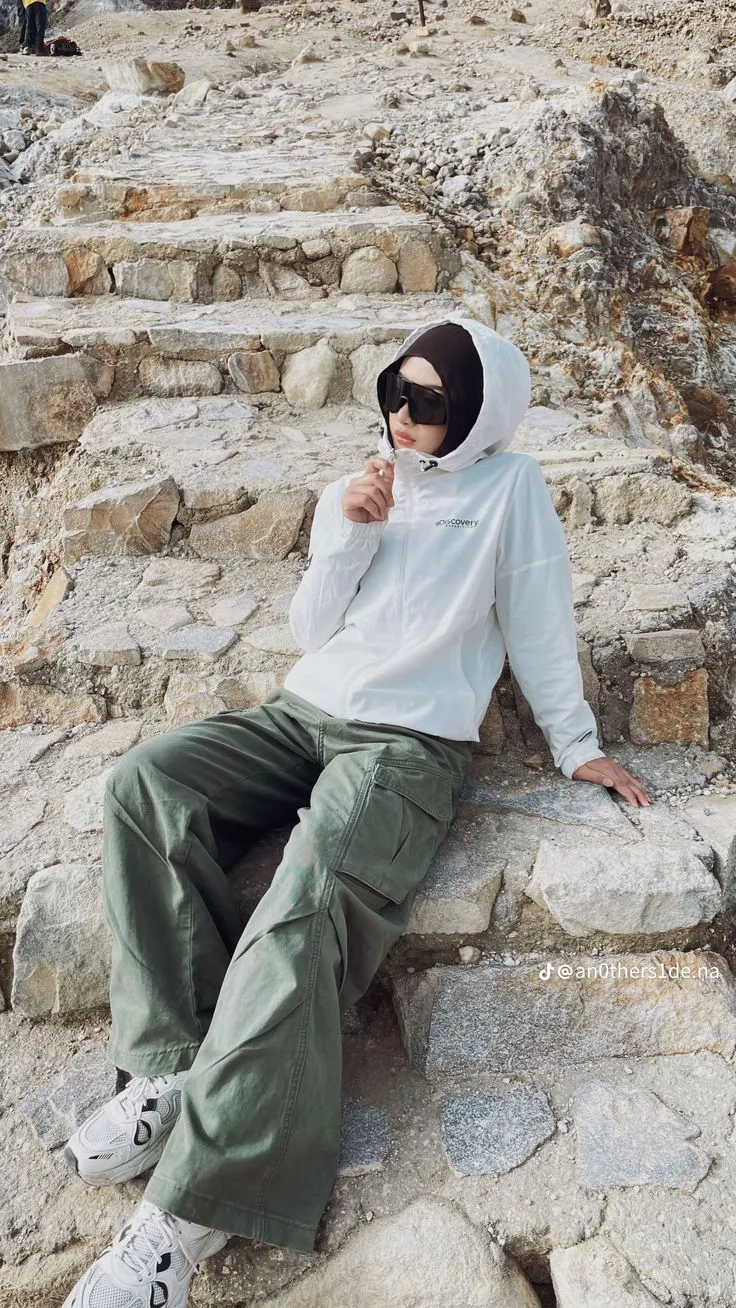 Punya jaket mendaki gunung tapi bingung mau mix and match-nya? Kamu bisa kombinasikan wide-fit cargo pants warna olive dan hoodie parasut putih karena selain fleksibel, juga kelihatan sporty, fresh, dan ringan banget. Terlebih lagi warna olive memang identik sama nuansa outdoor.
