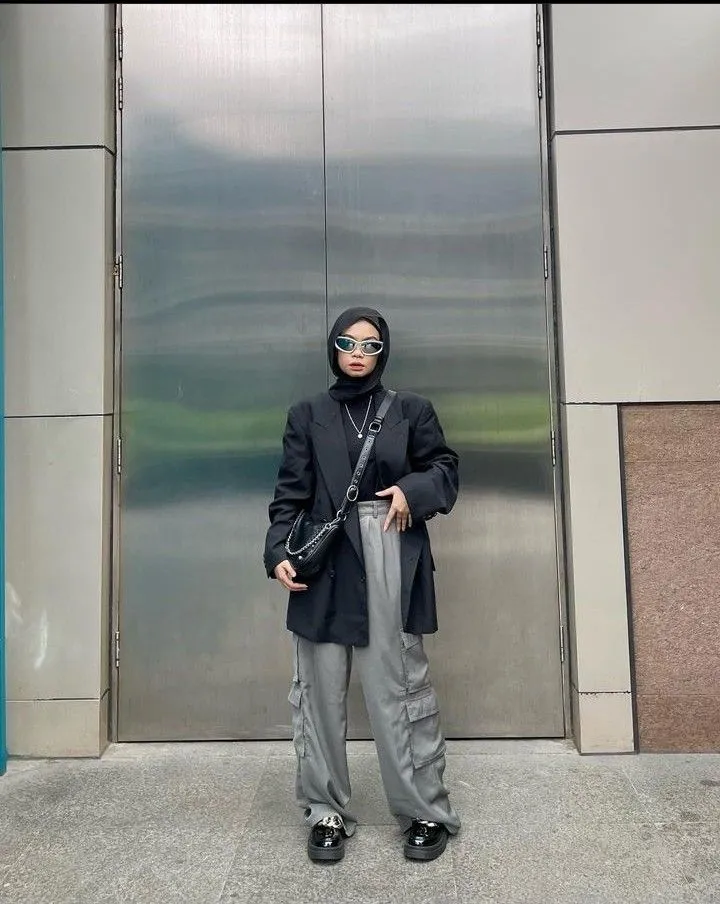 Cargo pants abu-abu yang dikombinasikan dengan blazer hitam bikin look kamu tetap punya kesan kasual dan effortless, tapi juga tegas, jadi outfit-nya terasa lebih elevated. Pemilihan pashmina dan inner hitam juga bikin keseluruhan gayamu terlihat serasi, clean, dan cenderung monokrom. Hasil akhirnya cocok banget buat kamu yang mau tampil classy dengan vibe semi-formal yang masih nyaman dipakai buat ngampus, datang ke sebuah event, atau hangout.